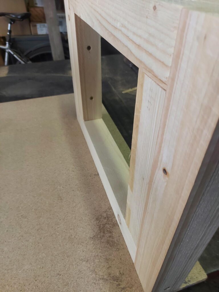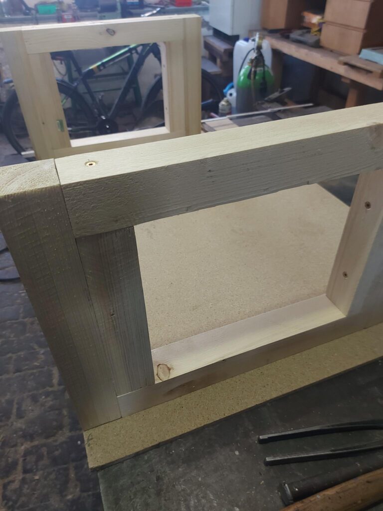 Danach wurde aus Kantholz 60×60 (ja, vielleicht überdimensioniert) ein Rahmen gebaut. Wichtig sind die wirklich EXAKTEN Winkel, da sonst später die Schubladen nicht gängig eingepasst werden können: