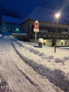 Das Appartement ist sehr gemütlich und warm. Uns wird mitgeteilt, dass der zweite Teil der Route nach Roncevalles über den Ibaneta Pass derzeit nicht zu bewältigen sei, da diverse Teile vereist seien und sich gerade das Wetter verändert, 50 Zentimeter Neuschnee sind in den letzten Stunden gefallen und es schneit leider ununterbrochen weiter. So beschließen wir, ein Hotel in Zubiri vorzubuchen für morgen und um 7:00 Uhr mit dem Taxi nach Roncevalles zu fahren.