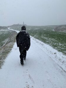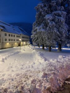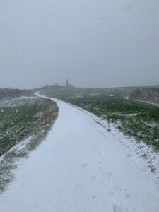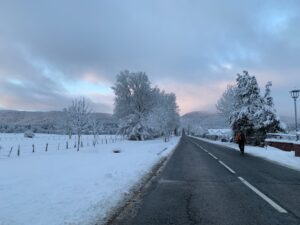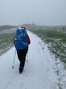 Um 7:30 Uhr kommen wir in Roncesvalles an, hier liegt noch viel höher Schnee als in Valcarlos. Auch der Weg als solches ist nicht zu laufen, höchstens vielleicht mit Schneeschuhen, die wir aber nicht haben. Also geht es die Landstraße lang, auf hartem Asphalt. Leider machen die Bars oder Cafés erst ab 01.03. wieder auf, wenn die Pilgersaison beginnt, das macht es nochmal schlimmer, nicht mal eine Pause kann man machen.