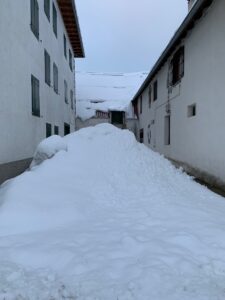 (C) Die Nacht in dem Appartement war angenehm. Die acht Amerikaner nebenan haben gefeiert, man konnte sie hören. Da uns die Vermieterin gestern warnte, nicht den zweiten Teil der Route nach Roncesvalles zu laufen, haben wir ein Taxi für 7:00 Uhr bestellt. Als es pünktlich vor der Tür steht, staunen wir nicht schlecht, wie hoch der Schnee liegt und wie hoch verschneit der Ibaneta Pass ist, das hätten wir selbst auf der Landstraße nicht laufen können, viel zu gefährlich.