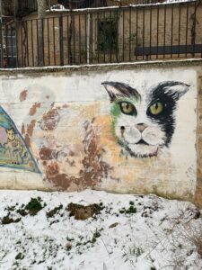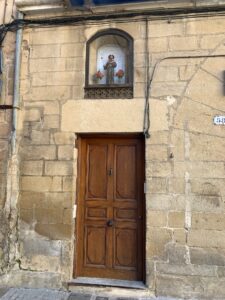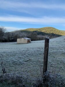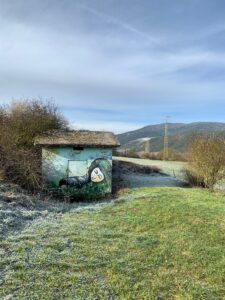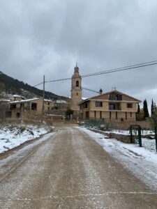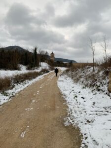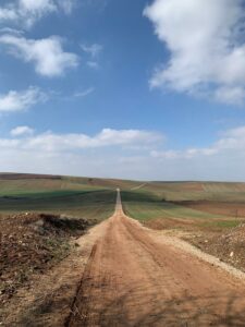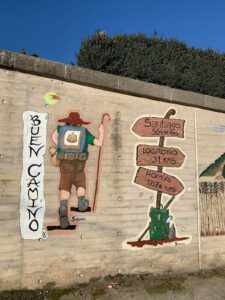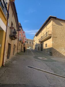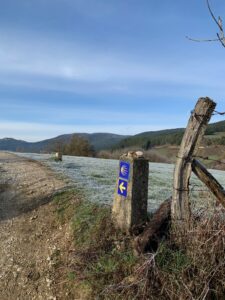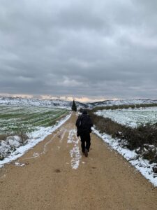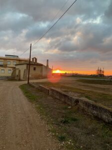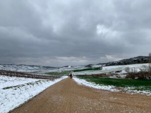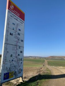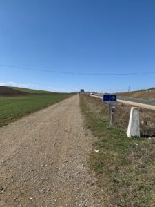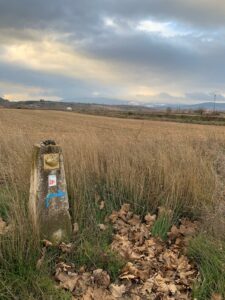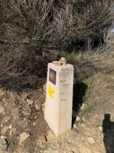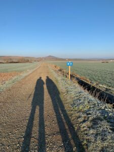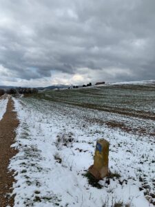 Gegen 8:15 Uhr laufen wir los. Es ist blauer Himmel mit Sonnenschein, aber es hat -2 Grad und außerhalb der Stadt weht ein eisiger Wind. Wir freuen uns auf die Etappe bei dem Wetter und vor allen Dingen einen leckeren Café. Doch Pustekuchen, jede Bar ist geschlossen, so hatten wir uns das leider nicht vorgestellt. Vermutlich ist es sonntags einfach nochmal etwas ganz anderes. Erst zwei Orte vor Belorado kehren wir in so eine Art spirituelle Herberge ein. Dort bekommen wir Kaffee mit Milch und etwas Obst auf Donativa Basis. Der nächste Ort – 4,5 Kilometer vor Belorado – hat auch noch eine kleine Bar und auch hier trinken wir noch etwas.