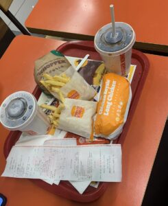 Wir wollen noch schnell etwas einkaufen, aber leider sind alle Geschäfte bereits geschlossen. Nur ein asiatischer Krimskrams Laden ist noch auf. Wir kaufen Baguette und Thunfisch in der Dose und ein paar Getränke. Dann wollen wir Essen gehen, doch in jedes Lokal, das wir betreten, werden wir entweder nicht beachtet oder abweisend betrachtet. Obwohl in einem italienischen Lokal fast alle Tische leer sind, ist man bereits ausgebucht… Es ist noch keine 18:00 Uhr, ein Tisch für eine Stunde hätte doch gereicht. Aber alles klar, schon verstanden, Pilger unerwünscht. Da plötzlich taucht ein Burger King auf! Burger King fragt nicht wer kommt! 🤗Das Menü war ganz lecker und nicht mal so teuer. Anschließend kaufen wir uns noch eine Flasche Wein im asiatischen Geschäft und dann gehts in die Pension.