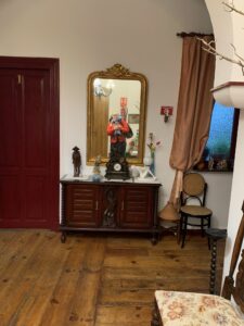 (C) Gegen 7:00 Uhr stehen wir auf. Als ich ins Bad gehe, ist das Bad völlig nass und vernebelt, weil da irgendein/e Pilger/in morgens nochmal duschen musste, so ein Wellness Badezimmer muss ja genutzt werden.