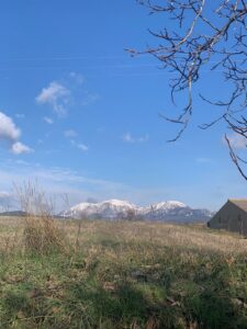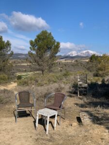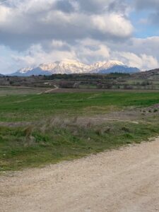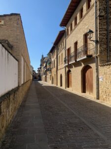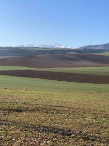 Wir frühstücken gemütlich und ich tausche noch mit Diana, einer Australierin, die wir in Pamplona kennengelernt hatten, die Handynummern für Whatsapp aus, dann marschieren wir los. Die ersten 3 Kilometer langweilig durch die Stadt, dann wird’s extrem weitsichtig und die verschneiten Piccos sind in der Ferne zu sehen.