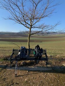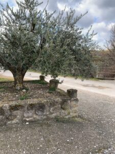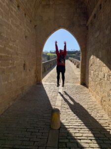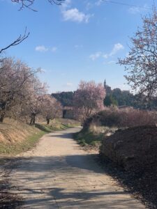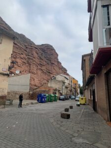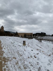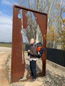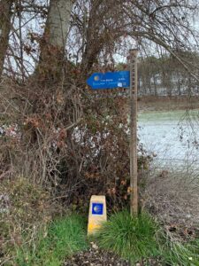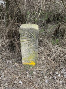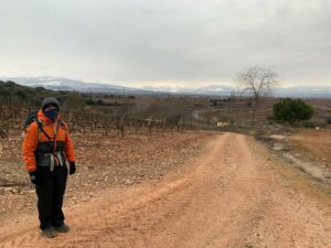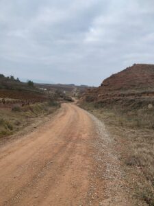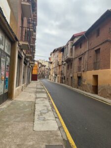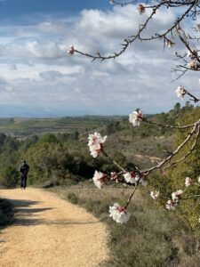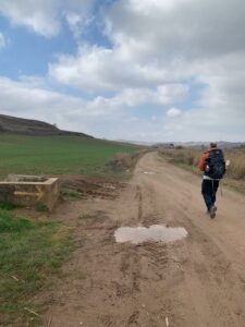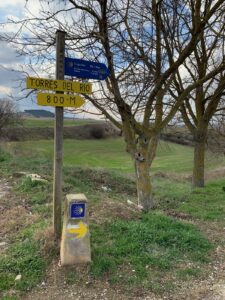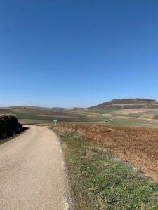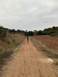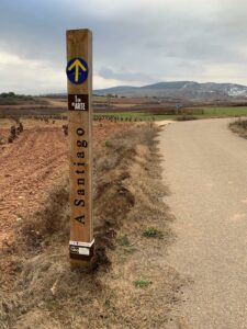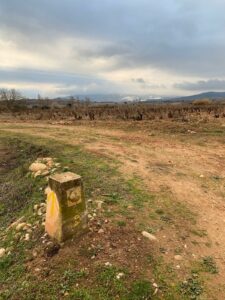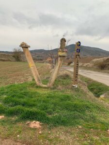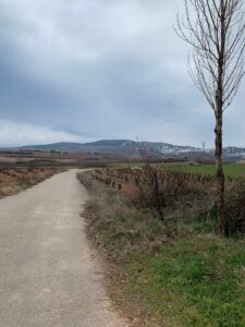 Gegen 8:40 Uhr laufen wir los, es fühlt sich mittlerweile schon fast frühlingshaft an, aber die Temperatur liegt bei 5 Grad und der Wind im freien Feld ist leider noch eisig. In Azofra trinken wir jeder zwei leckere Café con leche. Zu Beginn haben wir die ersten Höhenmeter und nach Azofra folgt direkt pro Ort eine weitere Steigung. Vor Ciruena treffen wir Patrick „I got ruined“ bzw „I have to suffer“ beim Anstieg und er tut sich unglaublich schwer. Auch ich quäle mich und so laufen wir ein bisschen gemeinsam. Er möchte heute nach Santo Domingo, da er dort Teo und Ineas treffen möchte. Ich teile ihm mit, dass es leider nochmal vor Santo Domingo einen An- und Abstieg hat und er vielleicht mit dem Bus den Abschnitt fahren soll, aber das möchte er auf keinen Fall. Er will „suffering“, verkündet er uns.