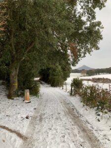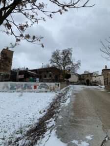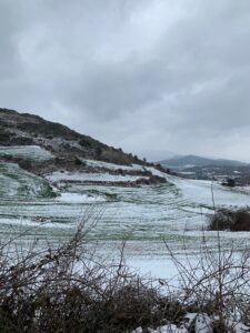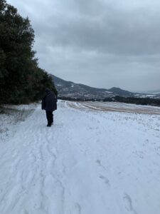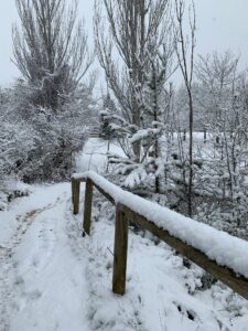 Um sechs konnte ich nicht mehr schlafen und stand auf, alle asiatischen Pilger waren auch schon bereits im Aufenthaltsraum. Also kurze Katzenwäsche und dann Frühstück gemacht. Das Wetter sollte heute nur bedeckt sein, aber stattdessen schneit es und zwar aus Kübeln bis Estella. Einkehrmöglichkeit gab es wenige. Die Erste war zu früh, die Zweite in Villatuerta zu spät. Wenn man stundenlang schon vom Schnee aufgeweicht ist, will man nicht mehr mit nassen Klamotten in ein aufgeheiztes Café, da man sich danach draußen zu Tode friert.