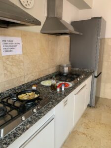 Als wir endlich um kurz vor zwei in Palas de Rei ankommen, stellen wir fest, dass die Herberge fast am Ortsausgang liegt. Da gehen dann nochmal zwei Kilometer mehr auf die Uhr fürs Einkaufen. Immerhin müssen wir dann morgen nicht durch den ganzen Ort. Die Herberge ist schön und super sauber. Und wenig besucht, wir sind gerade mal 5 Pilger heute. Nach dem Einkaufen machen wir uns noch lecker Essen in der Küche, die auch sehr sehr sauber ist.