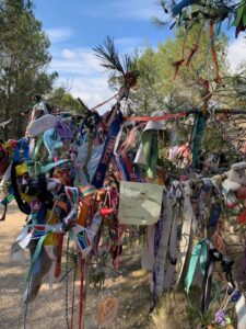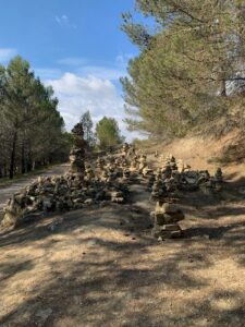 Das Wetter ist heute wunderbar sonnig, aber durch den eisigen Wind auch sehr kalt. Ich bewundere immer wieder rechter Hand die spektakuläre Bergkulisse, die noch schneebedeckt ist. Ein traumhafter plastischer Anblick, den man auf den Bildern nicht richtig wahrnehmen kann. Die Etappe nach Viana ist ein auf und ab. Mitten auf dem Weg ein Meer aus Steinmännchen mit einem Wunsch-/Gedenkbaum an dem sehr viele Kleinigkeiten hängen, Bändchen, Haarschmuck und sogar ein Turnschuh liegt daneben. Ich kann mich gar nicht von dem Ort lösen, es fesselt mich sehr.