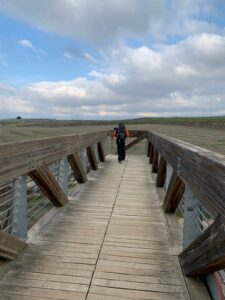 Der Weg ist sehr schön, unglaublich weitsichtig und rechts die verschneiten Piccos, traumhaft. Leider auch sehr schmerzhaft, Rüdiger hat starke Schmerzen in der Brustwirbelsäule und ich wie immer ab 15 Kilometer Krämpfe unter den Fußsohlen. Heute nur eine kurze Heulattacke übrigens…