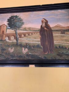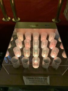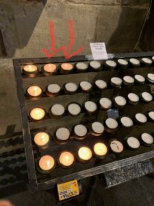 Gegen 8:15 Uhr starten wir. Es ist ziemlich voll, da schon wieder zwei Reisegruppen unterwegs sind. Auch der Spanier nutzt den Palmsonntag, um nach Santiago hineinzulaufen. Als wir später in Lavacolla Café trinken, sehen wir im Fernsehen, was in Santiago heute los ist und sind froh, dass wir erst morgen am Montag dort ankommen. Die Menschenmassen törnen uns mächtig ab. In Lavacolla besuche ich auch wieder einmal eine offene Kirche und zünde für meinen Bruder und uns eine Kerze an. Der Pfarrer klingelt ständig die Glocke und lässt auch Pilger läuten.