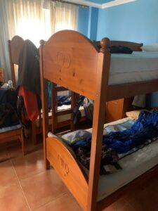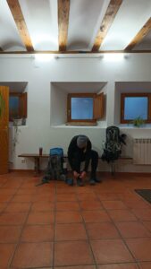 (C) Gegen 7:00 Uhr werde ich wach. In der Nacht wurde ich durch einen anderen laut albträumenden Pilger wach. Er jammert laut „I got ruin, I got ruin“. Da ich dann erst mal nicht wieder einschlafen kann, geht es in die Küche und dort werden unsere Thunfisch Baguettes für morgen vorbereitet. Der Wirt hat natürlich die Heizung nachts herabgesenkt und es wird ungemütlich kalt im Schlafraum. Zum Glück wärmt mich die Silbermatte und die Alu Sigg Flasche, die man – gefüllt mit heißem Wasser – hervorragend als Wärmflasche umfunktionieren kann.