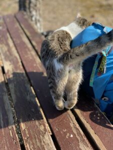 Es war etwas anders geplant, wir wollten eigentlich kurz vor 8:00 Uhr aufstehen, um das Frühstück noch mitzunehmen. Für die leeren Plätzchenpackung hat schon der „Weltpilger“ (seit Ewigkeiten unterwegs) gesorgt und um kurz nach 8:00 Uhr kommt auch ein hungriges Straßenpärchen hereinspaziert, erst er, dann sie, um Kaffee und Toast abzugreifen. Der Pilger zahlt’s … ohne Worte. Den Weltpilger versorge ich weiter mit Flugzeuggebäck und Japanbirne, er nimmt es dankbar an.