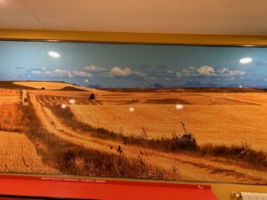 Wir stehen relativ spät auf, weil die Etappe nicht sehr weit heute ist. Gegen 8:15 Uhr sind wir mit der Schulklasse zusammen unterwegs, es ist wie immer ziemlich voll. Die erste Pause für einen Kaffee machen wir nach ca 6 Kilometer, nachdem wir ein paar Hügel überwunden haben. Leider mühen wir uns auch heute wieder mit unserem permanenten körperlichen Erschöpfungszustand ab, es wird nicht besser. Wir legen auch nochmal eine Sandwichpause ein, die auch nicht viel weiterhilft, spätestens nach dem nächsten Hügel ist die Energie aufgezehrt. Es liegt vermutlich daran, dass man die Batterie bei der täglichen Laufleistung einfach nicht mehr mit einer Nacht frisch geladen bekommt. Es wird Zeit, dass wir ankommen.